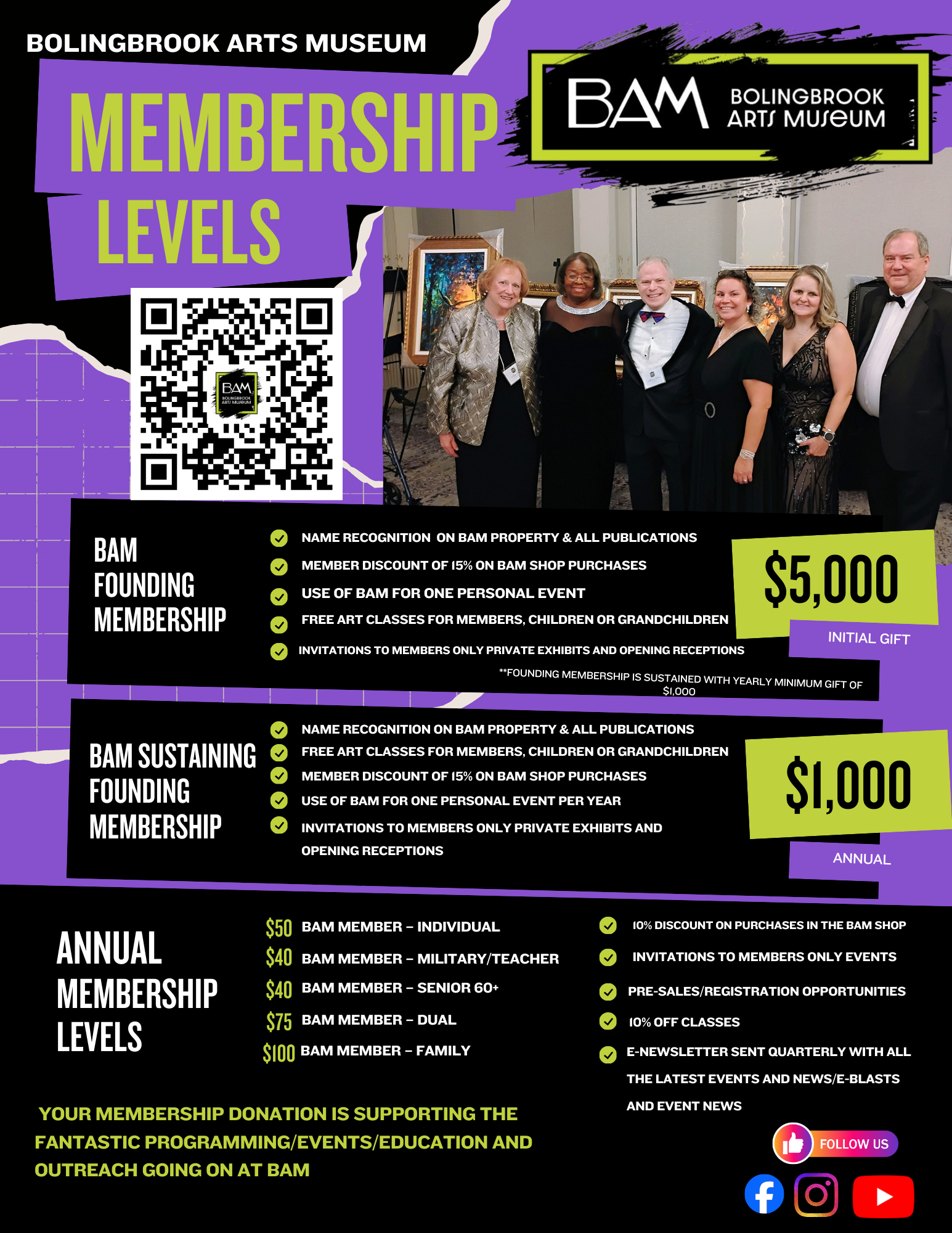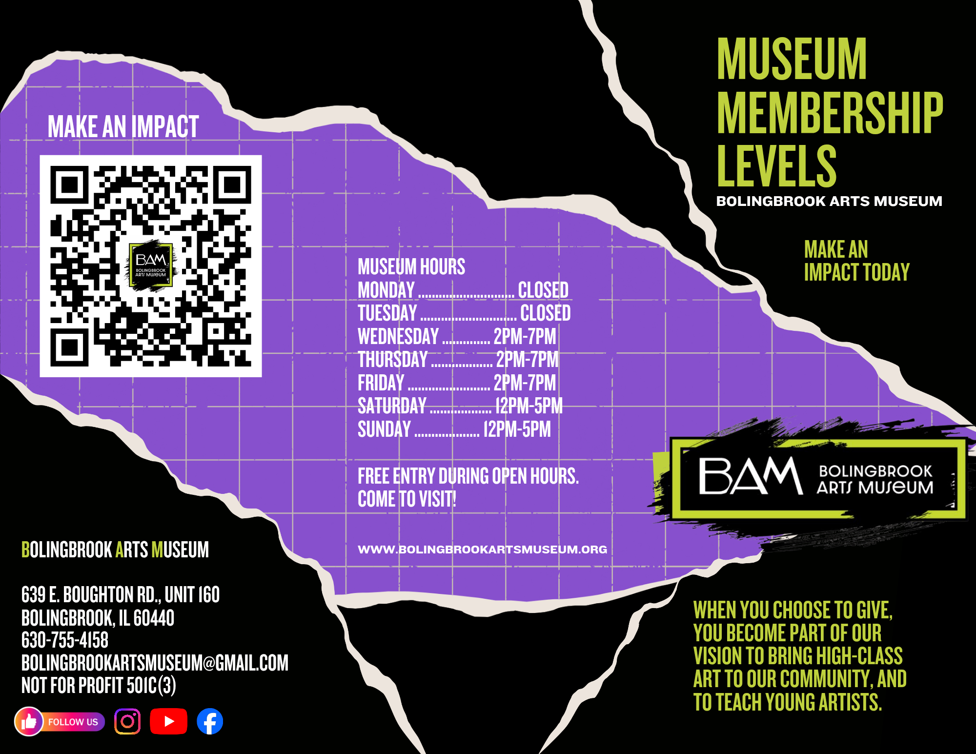 We are a nonprofit, and all donations go toward funding our mission to establish and maintain a premier museum in Bolingbrook, dedicated to educating, invigorating, unifying, and inspiring the community through diverse artistic expressions. This includes things like paying our teachers, buying supplies for free art classes, and throwing events for our community.